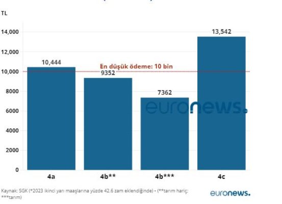 Buna göre 2023’ün ikinci yarısında 7 bin 324 lira olan 4a en düşük emekli maaşı Ocak 2024’te 10 bin 444 liraya; 6 bin 558 liran olan 4b maaşı 9 bin 352 liraya; 5 bin 163 lira olan 4b tarım maaşı 7 bin 362 liraya ve 9 bin 497 lira olan en düşük memur emeklisi maaşı 13 bin 542 liraya yükseldi.