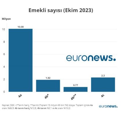 Ekim 2023 itibariyle Türkiye’de toplam 15 milyon 65 bin 742 emekli bulunuyor. Bunların yüzde 66,9’u işçi emeklisi (10.08 milyon); yüzde 12,8’i Bağ-Kur tarım hariç emekliler (1,92 milyon); yüzde 5,1’i Bağ-Kur tarım emeklisi (0,77 milyon) ve yüzde 15,2’si memur emeklisi (2,3 milyon). Bunlar emekli dosya sayısını gösteriyor.