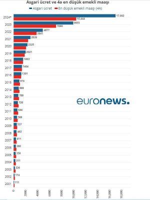 Euronews'te yer alan habere göre; en düşük emekli ve memur maaşlarının asgari ücrete oranı ise AKP iktidarında 2023 yılındaki kadar düşük olmamıştı. Ancak 2024 yılı emekliler için daha da kötü olacak. Asgari ücret ile karşılaştırıldığında 2024, işçi ve memur emeklileri için en kötü yıl olarak kayıtlara geçecek. Üstelik Cumhurbaşkanı Recep Tayyip Erdoğan 2024 yılını ‘Emekliler Yılı’ ilan etmiş durumda.