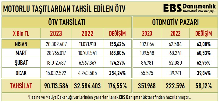 4 ayda tam 90 milyar 113 milyar TL’lik ÖTV tahsil edilmiş ki, bu yıl sonu hedefi olan 203 milyar TL’nin yüzde 44’üne tekabül ediyor. Pazarda satışlar böyle giderse yıl sonunda ÖTV geliri hedefinin 300 milyar TL’yi bulması içten bile değil.