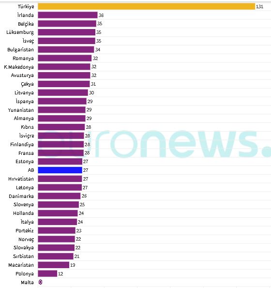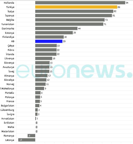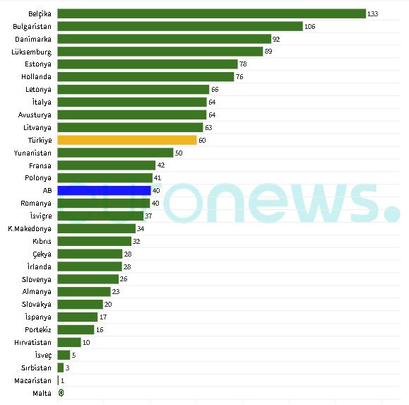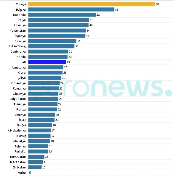 Türkiye’nin ardından ikinci sırada yüzde 66 ile Belçika geliyor. Malta ise zam yapmadığı için son sırada.