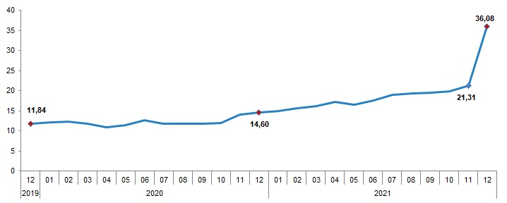 Türkiye İstatistik Kurumu (TÜİK) aralık ayına ilişkin enflasyon rakamlarını açıkladı. Buna göre enflasyon aralıkta aylık bazda yüzde 13,58 oranında artış gösterdi. Yıllık enflasyon ise yüzde 36,08’e yükseldi. Üretici enflasyonu ise aralıkta aylık bazda yüzde 19,08, yıllık bazda ise yüzde 79,89’a çıktı. Söz konusu enflasyon ise beklentilerin üzerinde gerçekleşti. AA Finans’ın piyasa anketine göre aralıkta ortalama beklenti enflasyonun yüzde 8,54 çıkacağı yönündeydi.