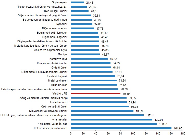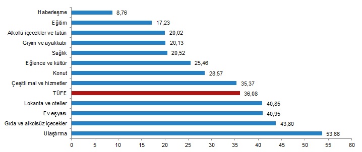 Yıllık en düşük artış yüzde 8,76 ile haberleşme ana grubunda gerçekleşti. Bir önceki yılın aynı ayına göre artışın düşük olduğu diğer ana gruplar sırasıyla yüzde 17,23 ile eğitim, yüzde 20,02 ile alkollü içecekler ve tütün ve yüzde 20,13 ile giyim ve ayakkabı oldu.