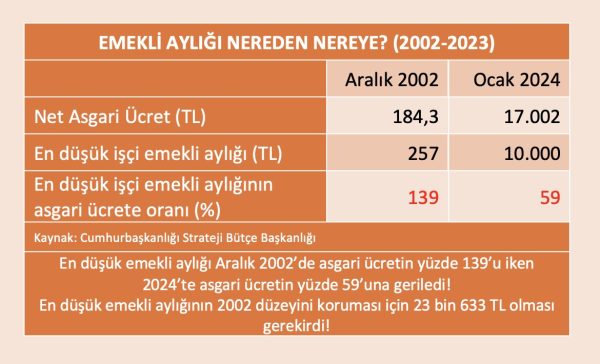 -Emeklilerin ezici çoğunluğunu ilgilendiren en düşük işçi emekli aylığı Aralık 2002’de asgari ücretin yüzde 139’u (184,3 TL, 66 TL değil) iken 2024’te asgari ücretin yüzde 59’una (10 bin TL) geriledi!