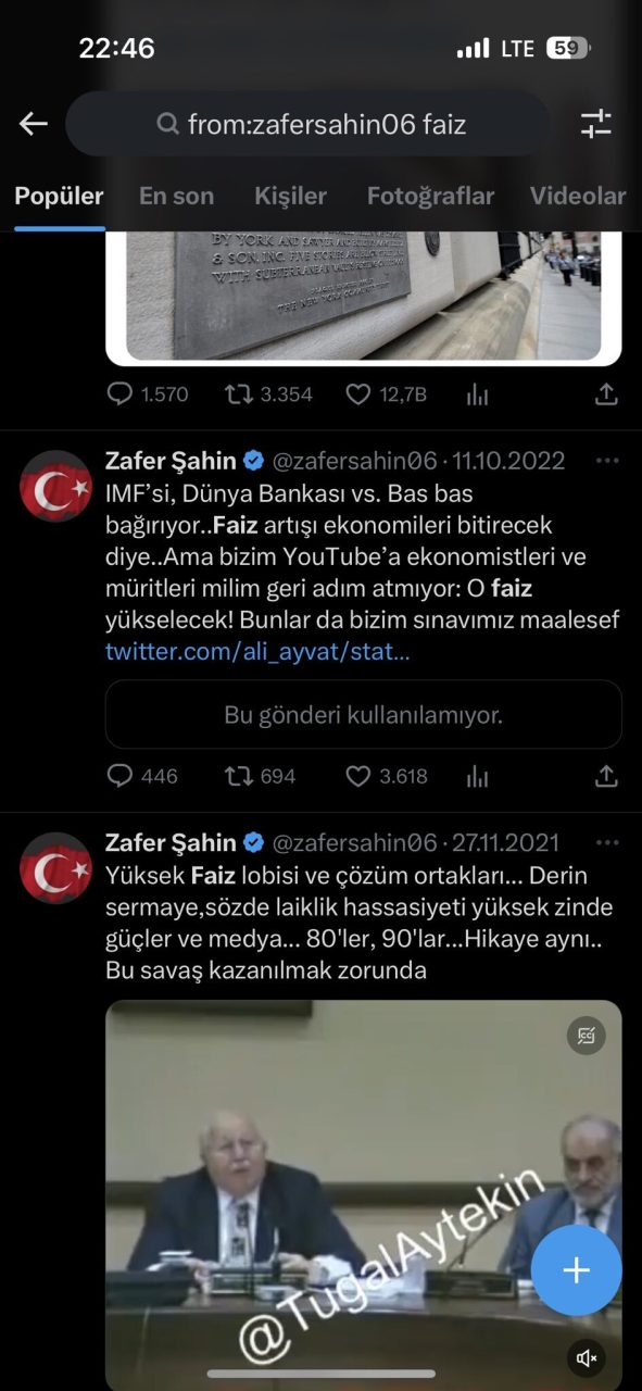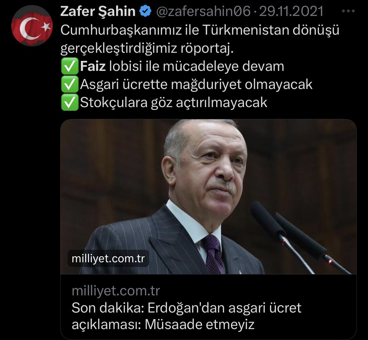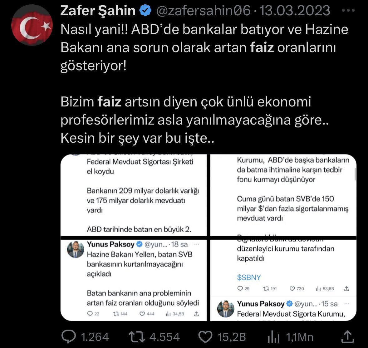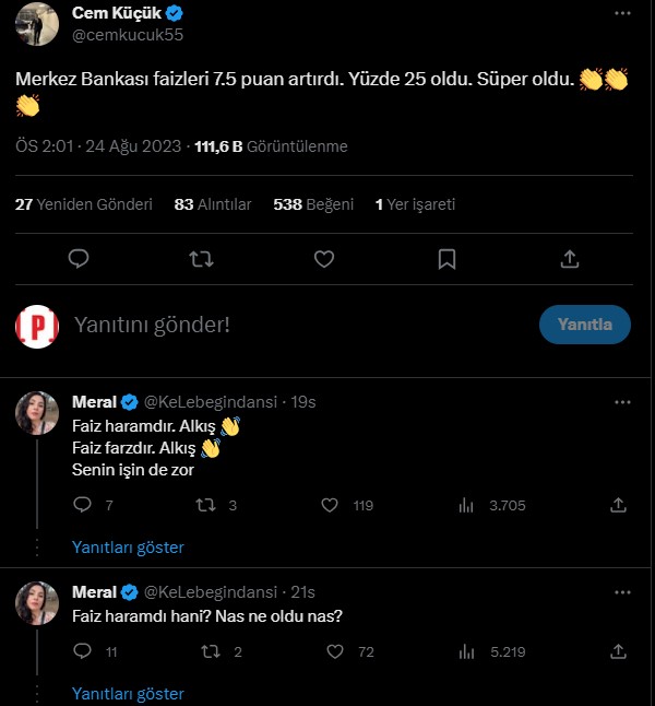 Yine iktidara yakınlığıyla bilinen gazeteci Cem Küçük ise "Merkez Bankası faizleri 7.5 puan artırdı. Yüzde 25 oldu. Süper oldu." diyerek yazısının sonuna da alkış emojisi ekledi. Bir takipçisi ise Küçük'e yanıt olarak "Faiz haramdır. Alkış. Faiz farzdır. Alkış. Senin işin de zor" dedi.