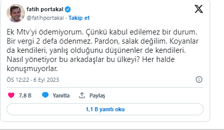 Gazeteci Fatih Portakal “Bir vergi 2 defa ödenmez. Pardon, salak değilim” diyerek ek Motorlu Taşıtlar Vergisi‘ni (MTV) ödemeyeceğini duyurdu.Hükümetin 11 ilde yıkıma yol açan 6 Şubat depremini gerekçe göstererek ek Motorlu...