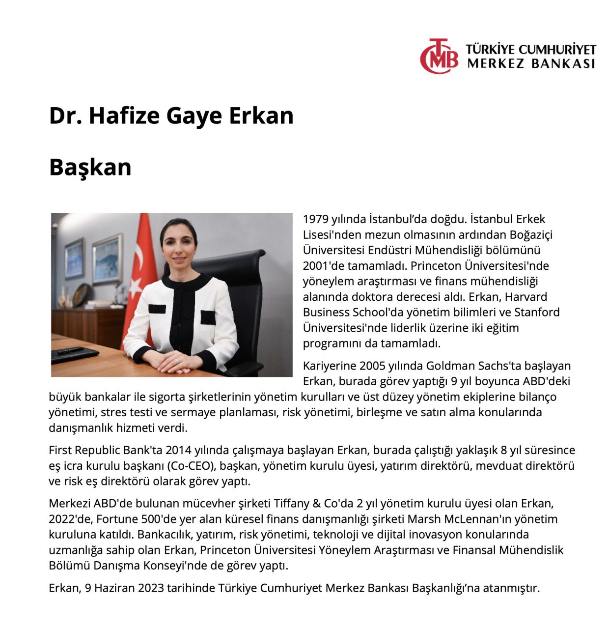 "Yeni Merkez Başkanı ataması yasaya uygun mu? Merkez Başkanı Hafize Gaye Erkan'ın özgeçmişi TCMB resmi web sitesinde yayımlandı. Yeni başkanın endüstri mühendisliği ve finans eğitimi aldığı ve bankacılık alanında bilgi ve tecrübesi olduğu görülüyor. Ancak Başkanın özgeçmişinde TCMB Kanunu'nun 25. maddesinde yer alan ve atama için zorunlu şartlar arasında yer alan iktisat ve maliye alanlarında bilgi ve tecrübe sahibi olmak konusunda bilg yer almıyor. Sorumu tekrarlıyorum: Atama TCMB Kanunu'nun 25. maddesine uygun mu?"