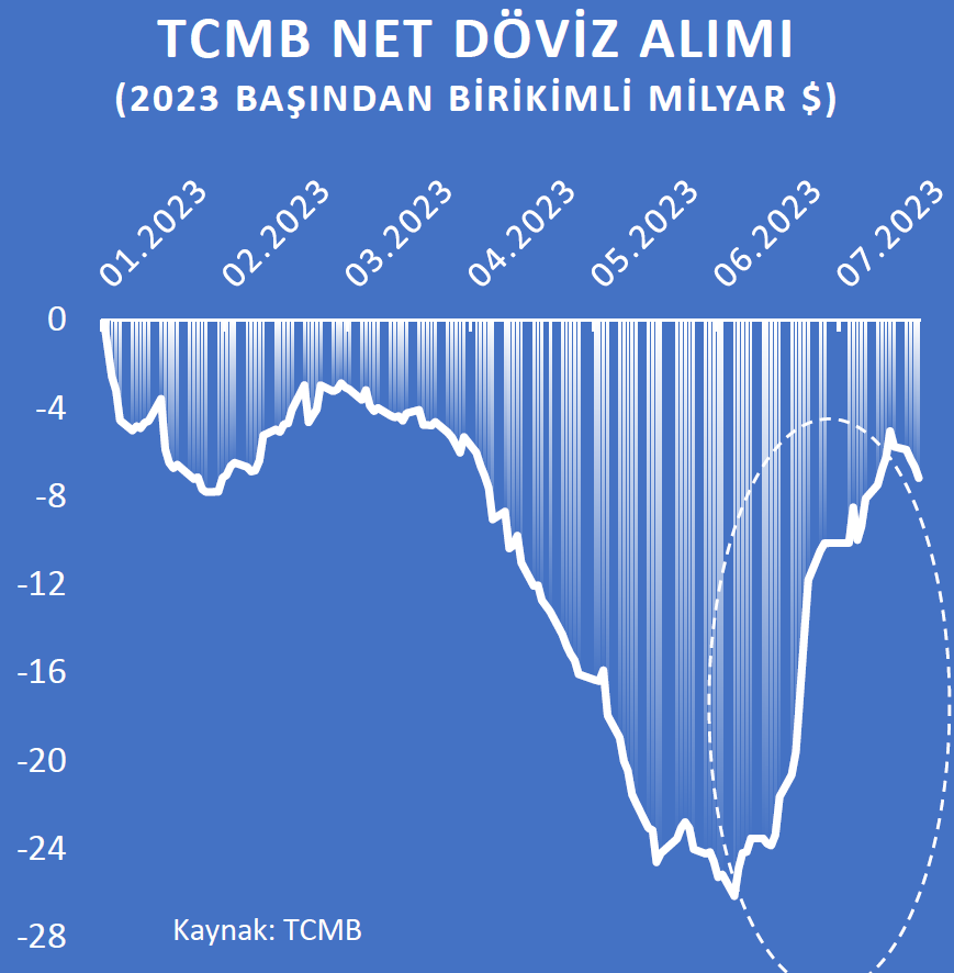 Seçim öncesinde doların yükselişini önlemek için Merkez Bankası "arka kapıdan" dolar satışı yapan Merkez Bankası'nın rezervleri eksiye düşmüş, seçim sonrasında ise TCMB Başkanlığına Hafize Gaye Erkan'ın, Hazine ve Maliye Bakanlığı'na da Mehmet Şimşek'in getirilmesinden sonra döviz satışları durdurulmuştu. Satışın durmasıyla da TCMB rezervleri yeniden yükselmeye başladı.