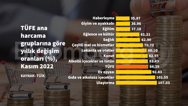 Ana harcama grupları itibarıyla 2022 yılı kasım ayında bir önceki aya göre en az artış gösteren ana grup yüzde -1.42 ile giyim ve ayakkabı oldu. Buna karşılık, 2022 yılı kasım ayında bir önceki aya göre artışın en yüksek olduğu ana grup ise yüzde 5.75 ile gıda ve alkolsüz içecekler oldu.