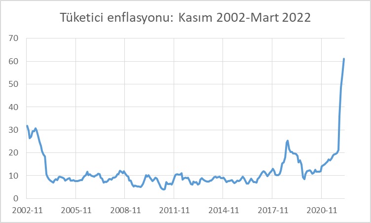 Türkiye İstatistik Kurumu (TÜİK) mart ayına ilişkin enflasyon oranlarını açıkladı. Buna göre enflasyon martta aylık yüzde 5,46 artarken yıllık ise yüzde 61,14’e yükseldi. Böylece enflasyon 20 yılın en yüksek seviyesine ulaştı. Enflasyon bu yılbaşından itibaren yüzde 22,81 arttı.