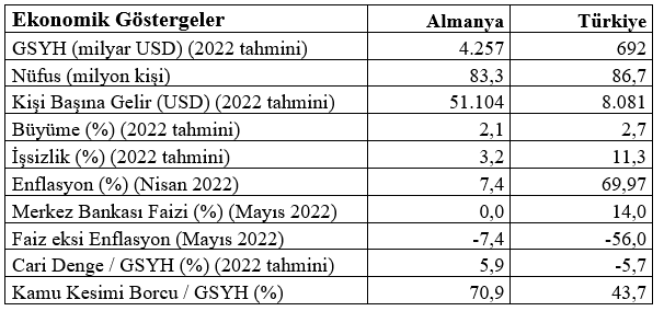 Son günlerde yurt dışında yaşayan ve Türkiye’ye ziyarete gelen yurttaşlarımız kanalıyla Almanya’nın battığı, bizim daha iyi durumda olduğumuza ilişkin bir şehir efsanesi yayıldı. Aşağıda iki ülkenin başlıca ekonomik göstergelerini karşılaştıran bir tablo sunuyorum (kaynak: IMF, World Economic Outlook Database, April 2022.)