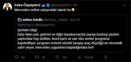 "İçeriden bilgi: hata falan yok. galerici ve diğer karaborsacılar parayı bastırıp yazılım yaptırdılar hep birlikte. kredi kartı ve sair tüm veriler programa kaydediliyor. program sistemi sürekli tarayıp araç düştüğü an otomatik satın alıyor. Mercedes uygulama başladığından beri"