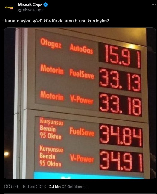 Dergi'nin Twitter hesabından yapılan paylaşımda zamlı akaryakıt fiyatlarının yer aldığı bir görsele "Tamam aşkın gözü kördür de ama bu ne be kardeşim?" notu düşüldü.