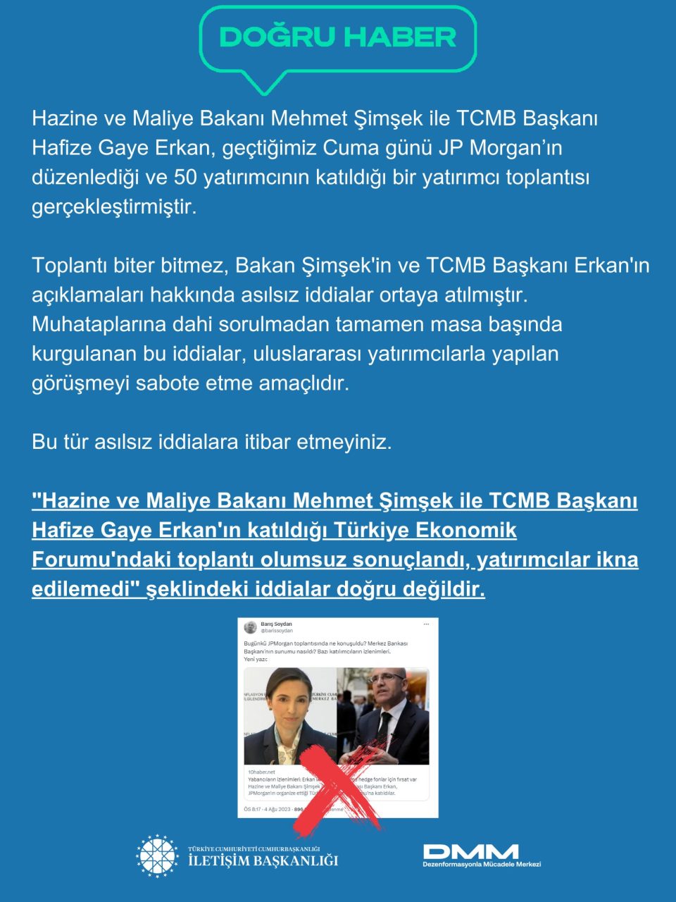 Cumhurbaşkanlığı İletişim Başkanlığı Dezenformasyonla Mücadele Merkezi gazeteci Barış Soydan'ın, TCMB Başkanı Hafize Gaye Erkan ile Hazine ve Maliye Bakanı Mehmet Şimşek'in katıldığı ve JP Morgan tarafından düzenlenen yatırımcı toplantısının olumsuz geçtiğine dair yazıyı yalanladı. Soydan ise Dezenformasyonla Mücadele Merkezi'ne "Kaynağınız ne?" şeklinde yanıt verdi.