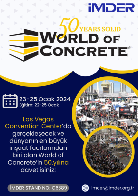 Türkiye İş Makinaları Distribütörleri ve İmalatçıları Birliği (İMDER), ABD’nin Las Vegas kentinde düzenlenecek World of Concrete (WOC) Fuarı’na katılacak. Dünyanın en büyük inşaat fuarlarından biri olan WOC Fuarı, bu yıl kapılarını 50. kez açacak ve 22-25 Ocak 2024 tarihleri arasında yapılacak.