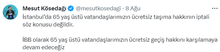 65 yas üstü vatandaşların ücretsiz ulaşım hakkının bu zamlarla birlikte kaldırılıp kaldırılmayacağı tartışılırken İBB CHP Grup Sözcüsü Mesut Kösedağı sosyal medyada şu açıklamayı yaptı: