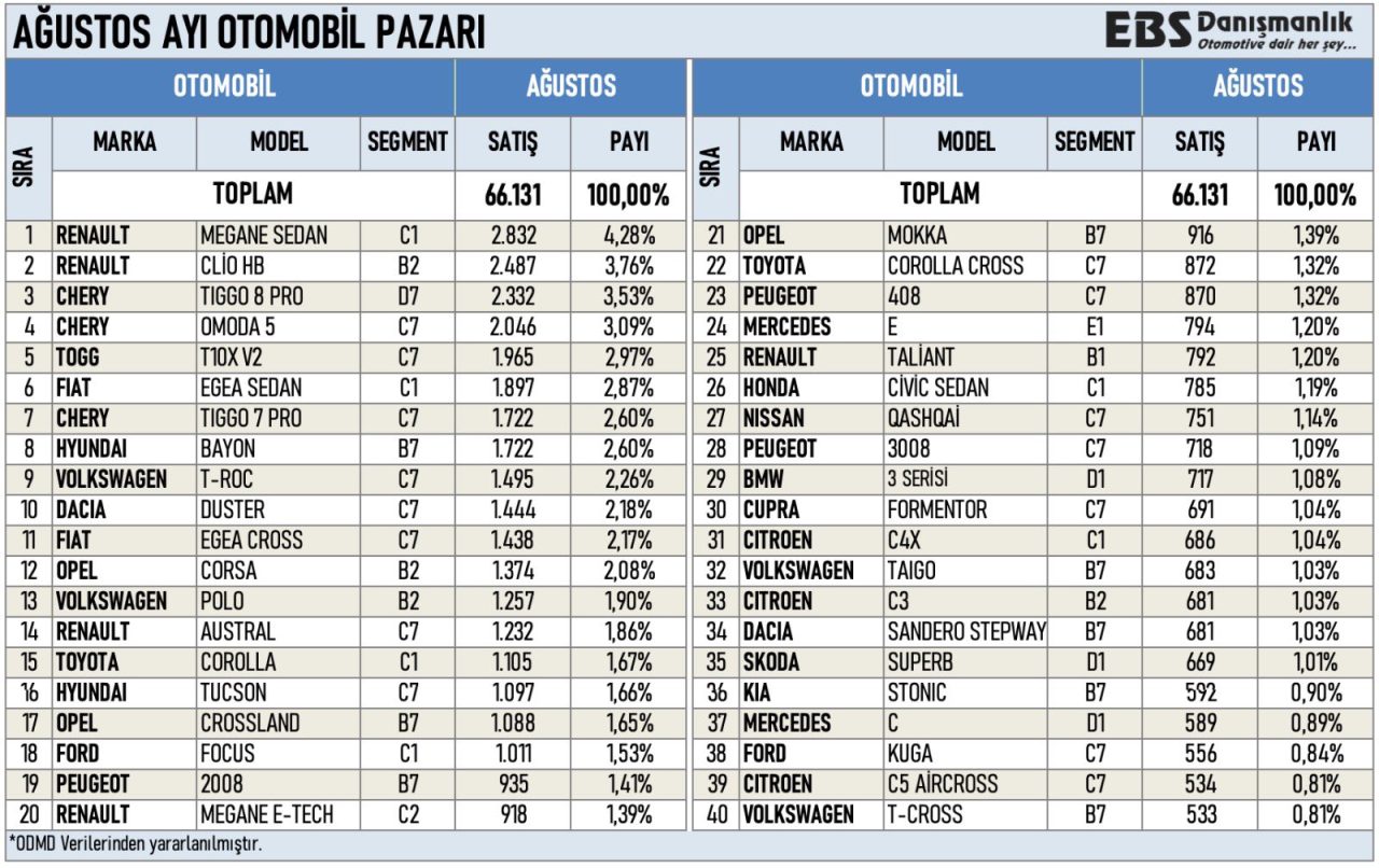 Özpeynirci'nin X hesabından paylaştığı tabloya göre Renault'un Megane modeli 1. ve Clio modeli ikinci sırada yer alırken, bu araçların satış adeti sırasıyla 2.832 ve 2.487 olarak kaydedildi.
