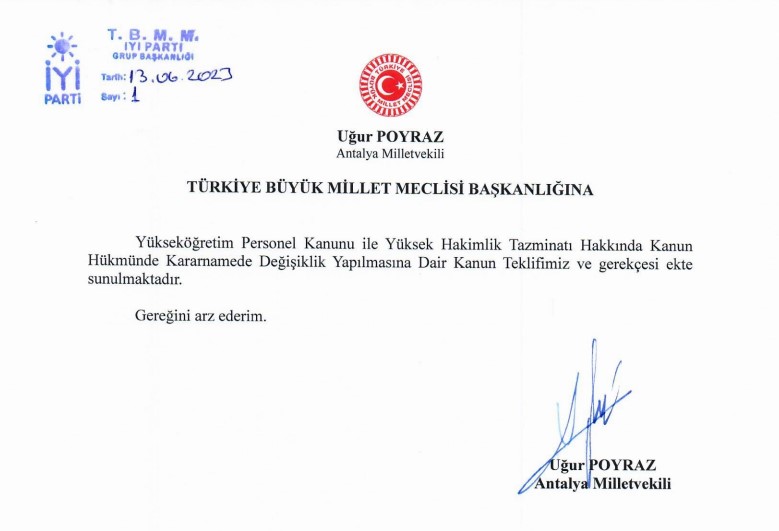 İYİ Parti Genel Sekreteri ve Antalya Milletvekili Uğur Poyraz, akademisyenlerin maaşlarında iyileştirme yapılması ve birinci sınıf olup Yargıtay-Danıştay üyesi seçilmeye hak kazanmış ve bu hakkı kaybetmemiş olan hakim savcılarla ilgili eşitsizliğin giderilmesi amacıyla bir kanun teklifi sundu.