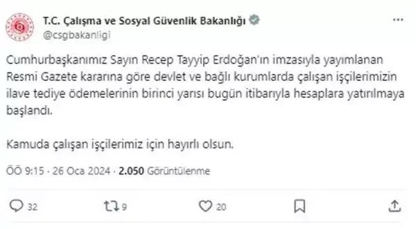 Çalışma ve Sosyal Güvenlik Bakanlığı, sosyal medya hesabından, "Cumhurbaşkanımız Sayın Recep Tayyip Erdoğan'ın imzasıyla yayımlanan Resmi Gazete kararına göre, devlet ve bağlı kurumlarda çalışan işçilerimizin ilave tediye ödemelerinin birinci yarısı bugün itibarıyla hesaplara yatırılmaya başlandı. Kamuda çalışan işçilerimiz için hayırlı olsun" açıklamasında bulundu.