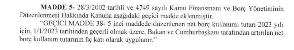 TBMM’ye sunulan torba kanun teklifinin 5. Maddesinin yazım biçimi, 2023 yılı için ilave 1 trilyon 865 milyar TL olmak üzere 2,1 trilyon TL’ye ulaşabilecek net borçlanma limiti sağlayacağı izlenimi doğurdu.