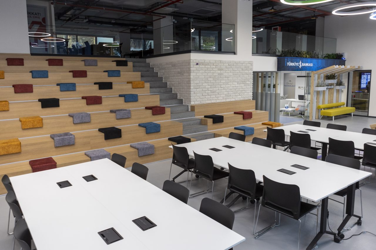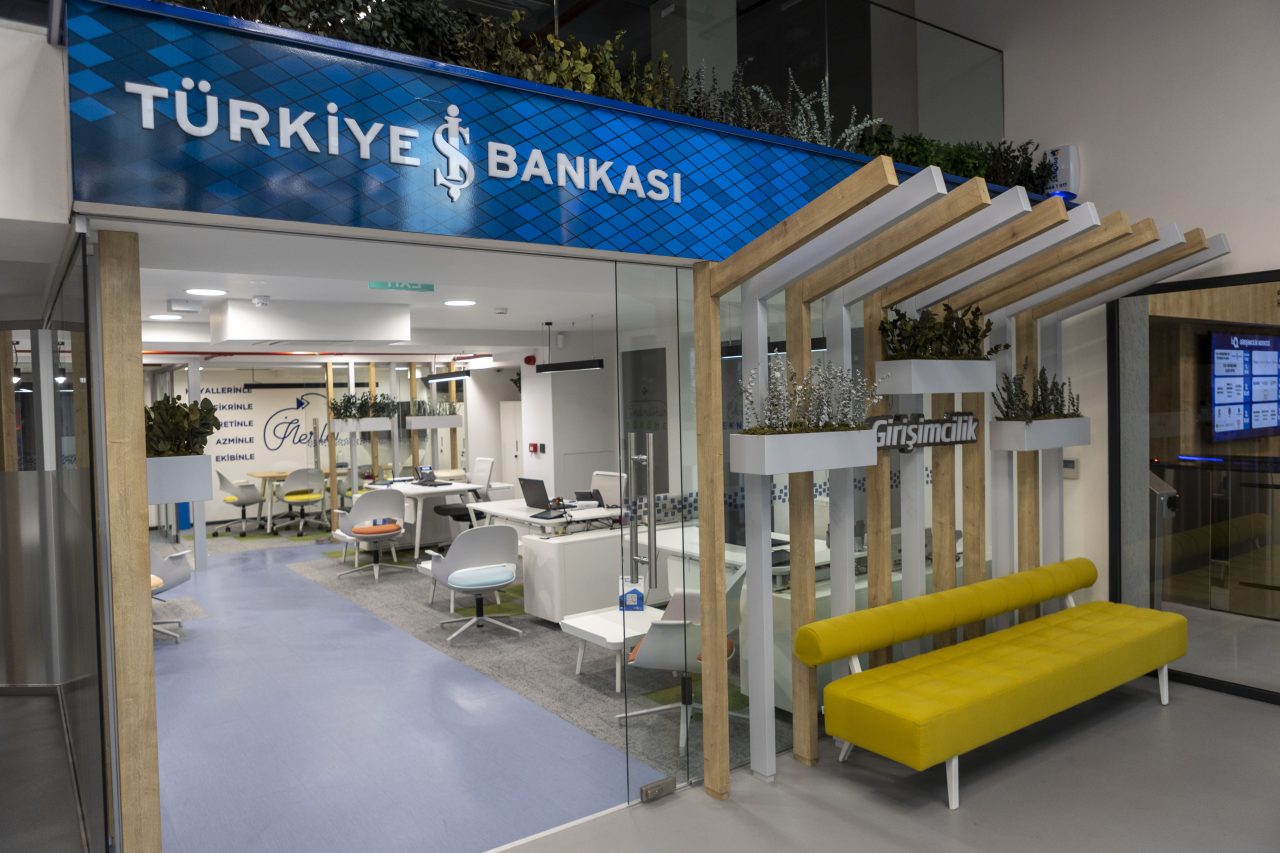 İçerisinde ofisler, toplantı ve etkinlik salonları ile muhtelif ortak kullanım alanları yer alan, şehrin en büyük ortak çalışma alanlarından biri olan ve bir girişimcilik platformu olarak aktif biçimde faaliyet gösteren İzQ Girişimcilik Merkezi içerisinde konumlanan İş Bankası İzmir Girişimcilik Şubesi, farklı şube tasarımı ve özelleştirilmiş hizmet modeliyle geleneksel banka şubesinden ayrışıyor.