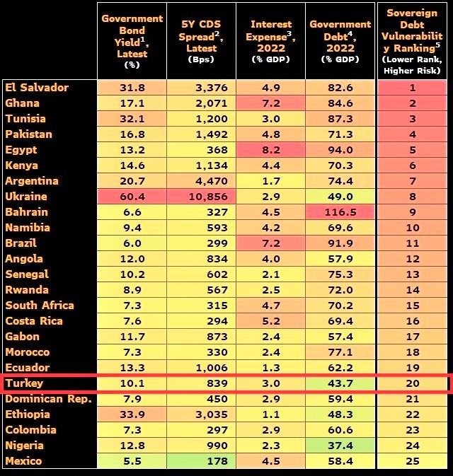 Ekonomide tablo böyle olunca gelişmekte olan ülke ekonomileri, zincirleme bir etkiyle borçlarını döndürememe riskiyle de karşı karşıya kalıyor. Bloomberg’e göre Türkiye, gelişmekte olan ülkeler arasında en yüksek borç krizi riskine sahip ülkeler arasında 20’nci sırada.