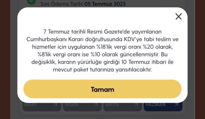 Turkcell kullanıcılarına yaptığı uyarıda yüzde 18'den 20'ye yükseltilen KDV oranlarının fiyatlara yansıyacağı bilgisini paylaştı. Yapılan uyarıda "7 Temmuz tarihli Resmi Gazete'de yayımlanan Cumhurbaşkanı Kararı doğrultusunda KDV'ye tabi teslim ve hizmetler için uygulanan yüzde 18'lik vergi oranı yüzde 20 olarak, yüzde 8'lik vergi oranı ise yüzde 10 olarak güncellenmiştir. Bu değişiklik, kararın yürürlüğe girdiği 10 Temmuz itibari ile mevcut paket tutarınıza yansıtılacaktır" denildi.