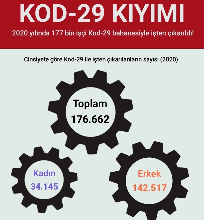DİSK Araştırma Merkezi’nin ulaştığı verilere göre, 2020 yılında 176 bin 662 kişi kod-29 gerekçe gösterilerek, işten atıldı. Bunlardan 34 bin 145’inin kadın olduğu belirtildi. Böylece kod-29 ile işten çıkarılanların sayısı ayda ortalama 14 bin 772 ve günde ortalama 491 kişi oldu. Bu işçiler, kıdem tazminatı ve ihbar tazminatı da alamadı, işsizlik ödeneğinden de yararlanamadı.