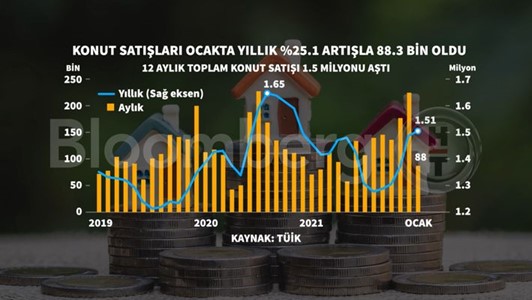 Türkiye genelinde ipotekli konut satışları ocak ayında bir önceki yılın aynı ayına göre yüzde 69,4 artış göstererek 18 bin 183 oldu. Toplam konut satışları içinde ipotekli satışların payı yüzde 20,6 olarak gerçekleşti.