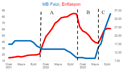 Enflasyon, faizin düşürülmesi sonucu, olağan hızının üzerinde yükseliyor (A bölgesi.) O aylarda enflasyon oranı olağan dışı yüksek oranlara varıyor. Aradan bir yıl geçince o yüksek oranlar tekrarlanmayınca enflasyon düşüşe geçiyor (B bölgesi.) İşte buna ‘enflasyon düşüşünde baz etkisi’ deniyor. Baz etkisi geçince, faiz de artırılmadığı için enflasyon yeniden olağan dışı oranlarla yükselmeye başlıyor (C bölgesi.) Bu kez enflasyonu frenlemek için Merkez Bankası politika faizi artırılmaya başlıyor ve enflasyon da sonunda aşağıya doğru dönüşe geçiyor.