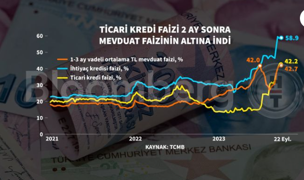 Türkiye Cumhuriyet Merkez Bankası'nın (TCMB) verilerine göre mevduatların ağırlıklı bölümünü oluşturan 1-3 ay vadeli mevduatlarda ortalama faiz 22 Eylül haftası itibariyle yüzde 42,7 seviyesine çıktı. Böylelikle mevduat faizi 20 yılın en yüksek seviyesine çıktı.