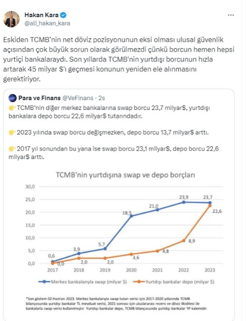 Merkez Bankası'nın eski başekonomisti Hakan Kara konuya ilişkin sosyal medyada bir paylaşım yaptı. Kara, "Eskiden MB’nin net döviz pozisyonunun eksi olması ulusal güvenlik açısından çok büyük sorun olarak görülmezdi çünkü borcun hemen hepsi yurt içi bankalaraydı. Son yıllarda MB’nin yurtdışı borcunun hızla artarak 45 milyar doları geçmesi konunun yeniden ele alınmasını gerektiriyor.” dedi.