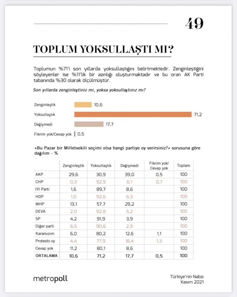 MetroPoll Araştırma Genel Müdürü Özer Sencar, sosyal medya hesabından “yoksullaşma” anketi yayınladı. Kasım ayı içinde yapılan ankete katılanların yüzde 71,2’si “Yoksullaştık” yanıtı verdi. Parti terciherine göre dağılıma bakıldığında Cumhur İttifakı koalisyonunu oluşturan AKP’nin yüzde 31’i ve MHP’nin yüzde 58’i “Yoksullaştım” diyerek ankete katıldı.