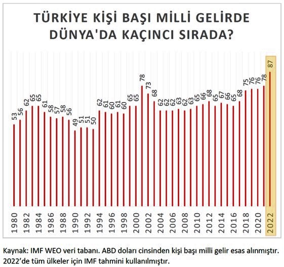 Bakan Mustafa Varank, “2002 öncesi dönem daha iyiydi iddiası kocaman bir yalan” diye paylaşım yaptı, “1984 - 2002 arası 19 yıllık dönemde Türkiye’de kişi başına milli gelirin ortalaması SADECE 2650 $’DI. Biz milli geliri artırarak iktidarımızda 9670 $’A YÜKSELTTİK.” dedi.