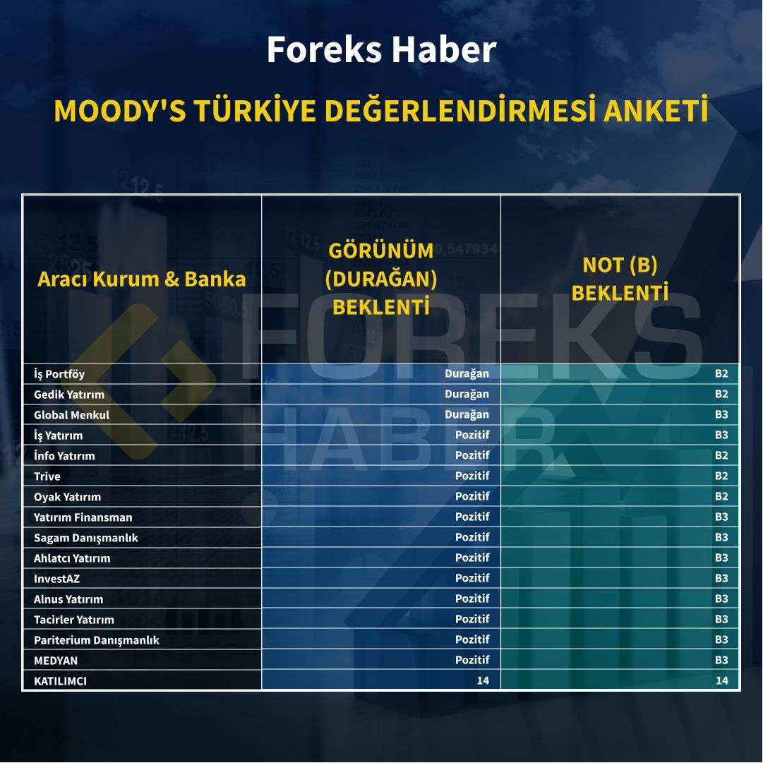 Foreks Haber'in düzenlediği ankete göre, Moody's tarafından yapılması beklenen değerlendirme için katılım sağlayan 14 ekonomistin 11'i görünümün "pozitif'e yükseltileceği görüşünü savundu. 5 ekonomist ise kredi notunun "B3"ten "B2"ye yükseltileceği tahmininde bulundu. Kredi notu değişikliği bekleyen 5 ekonomistin 2'si görünümün "durağan" olarak bırakılacağını, 3'ü ise "pozitif" olarak değiştirileceğini öngördü.