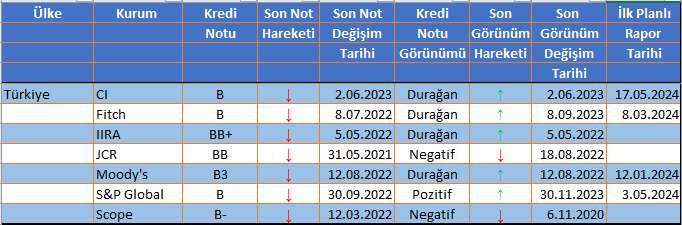 Türkiye'nin kredi notu görünümünü Fitch 8 Eylül 2023'te "negatif"ten "durağan"a, S&P Global 30 Kasım 2023'te "durağan"dan "pozitif"e yükseltti. İki kurum da kredi notunu "B" olarak teyit etti.