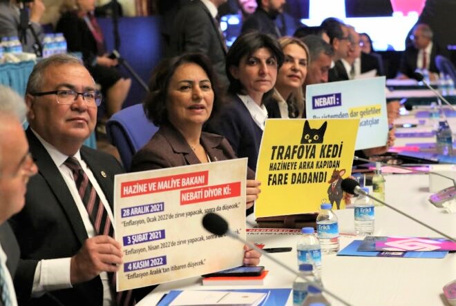 CHP Niğde Milletvekili Ömer Fethi Gürer’in taşıdığı dövizde, Nebati 28 Aralık’ta diyor ki, ‘Enflasyon Ocak 2022’de zirve yapacak sonra düşecek’. 3 Şubat’ta diyor ki, ‘Enflasyon Nisan 2022’de zirve yapacak sonra düşecek’ 4 Kasım’da diyor ki, ‘Enflasyon aralık ayından itibaren düşecek’ ifadeleri yer aldı.