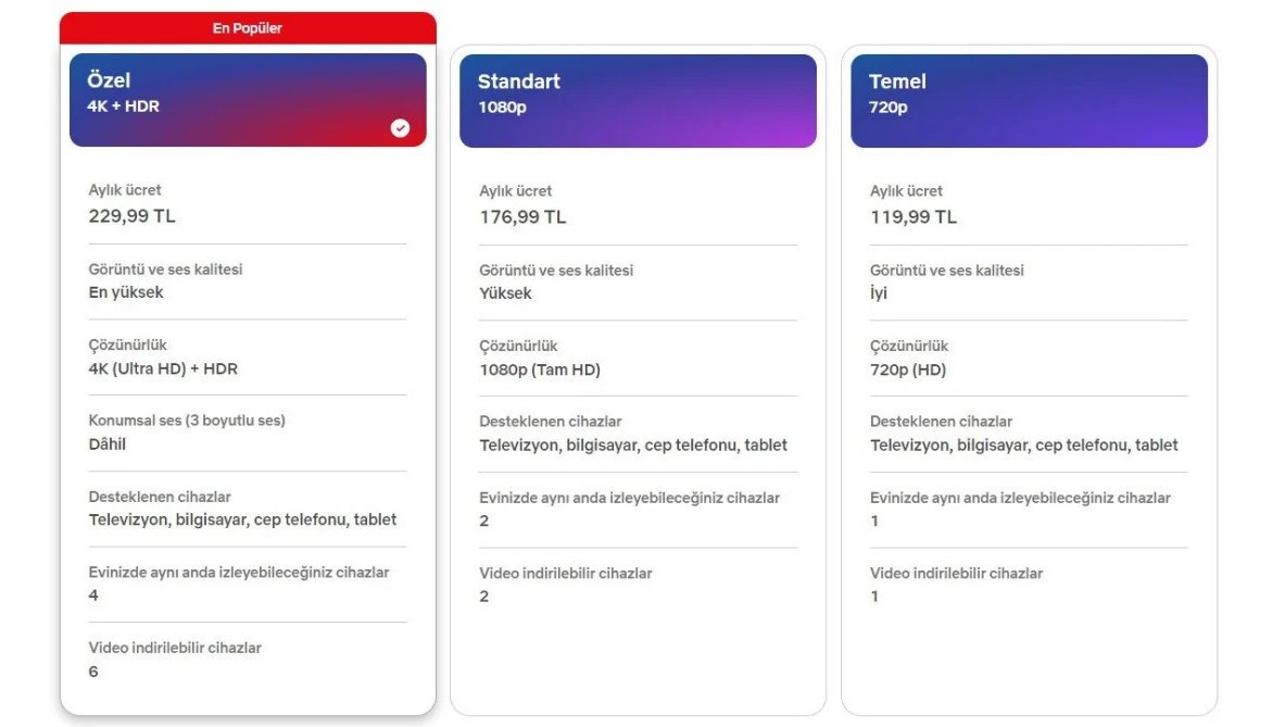 Kullanıcılara 4K çözünürlük sunan "Özel Plan"ın fiyatı ise 199,99 TL'den 229,99 TL'ye çıktı.