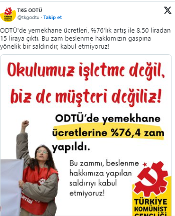 Türkiye Komünist Gençliği ODTÜ, yaptığı açıklamada “Okulumuz işletme değil, biz de müşteri değiliz” dedi.