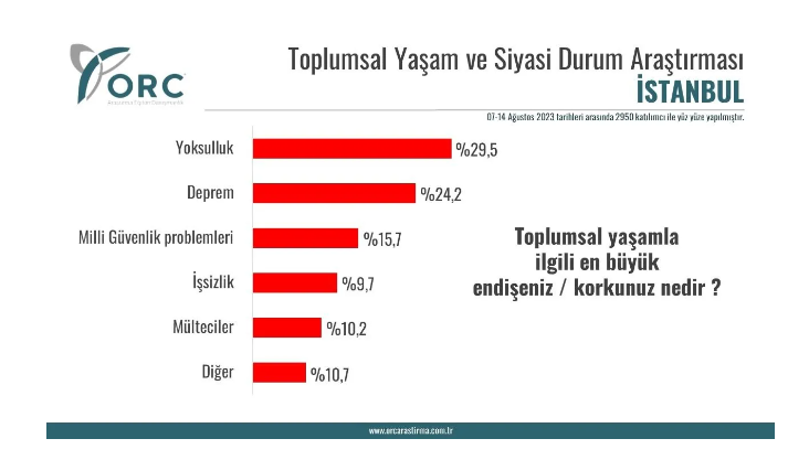 ORC Araştırma Şirketi, 1-14 Ağustos tarihleri arasında İstanbul'da 2950 katılımcı ile yaptığı anketin sonuçlarını paylaştı. Ankette katılımcılara, "Toplumsal yaşamla ilgili en büyük endişeniz/korkunuz nedir?" diye soruldu.