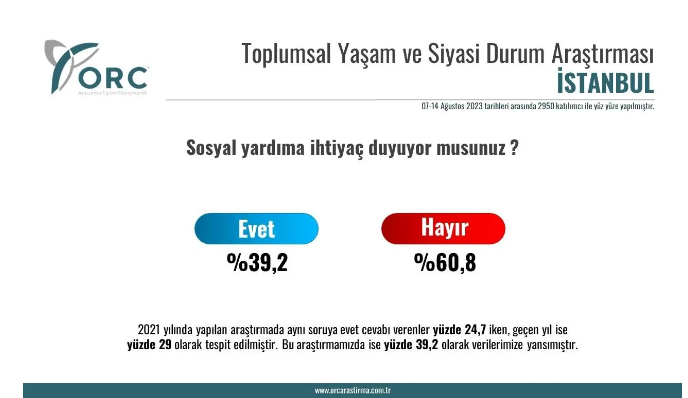 "Sosyal yardıma ihtiyaç duyuyor musunuz?" sorusuna ise katılımcıların yüzde 39,2'si "Evet", yüzde 60,8'i "Hayır yanıtını verdi.