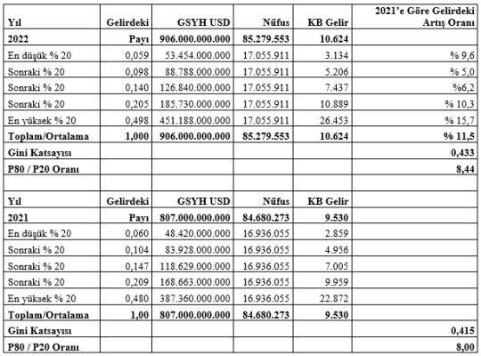 Üstteki tablonun son sütunu iki yılı karşılaştırmaya ayrılmış durumdadır. 2022 yılında bütün gelir gruplarının gelirlerinde 2021 yılına göre artışlar olmasına karşılık asıl büyük artış en yüksek gelir elde eden grupta yaşanmış görünüyor (yüzde 15,7).