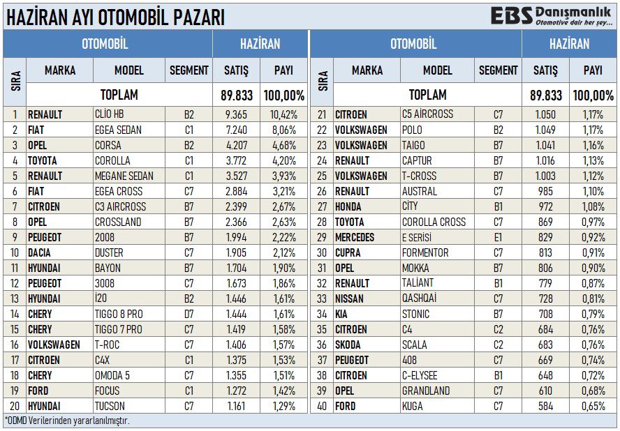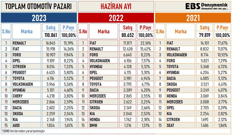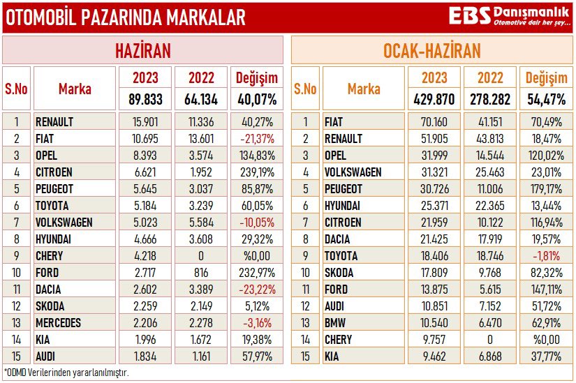 "Haziranda hem toplam satışlarda hem de otomobil satışlarında Renault atağa kalkarak uzun bir süre sonra Fiat'ı geçip, zirveye oturdu. Ama ilk 6 ay sonunda hem toplam satışlarda hem otomobil satışlarında Fiat açık ara liderliği devam ediyor. Haziranda Opel, Peugeot ve Citroen markalarındaki çıkış ise devam etti. Opel 3.sırada yer aldı"