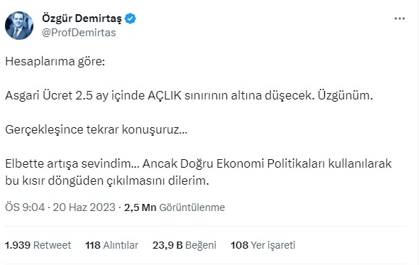 Ünlü ekonomist Prof. Dr. Özgür Demirtaş sosyal medya hesabından asgari ücretle ilgili değerlendirmelerde bulundu. Demirtaş asgari ücret için üzüldüğünü söyledi. Enflasyona dikkat çeken Demirtaş asgari ücretin 2.5 ay içinde açlık sınırının altına düşeceğini belirtti.
