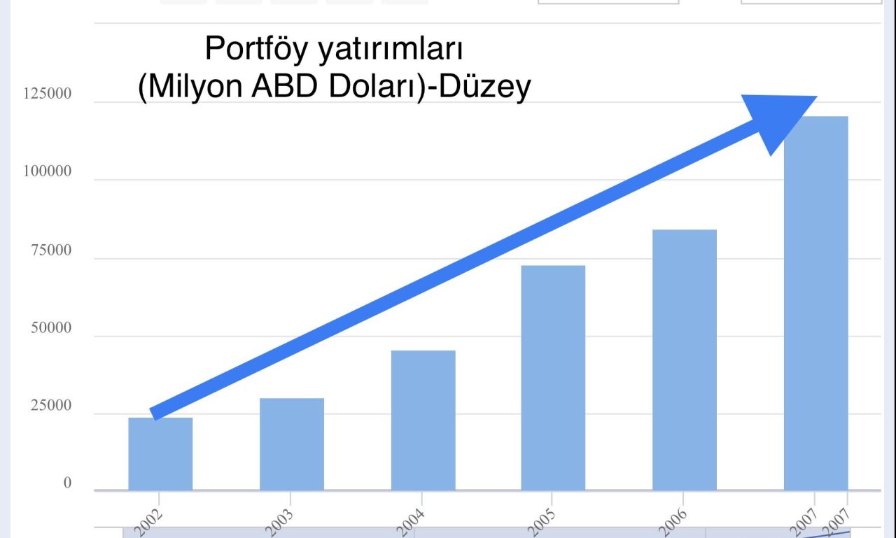 1) 2002-2007 arasında yurt dışı yerleşiklerin Türkiye’deki portföy yatırımlarındaki net artış 97 milyon USD olmuş. Dikkatinizi çekerim; bu ülkeye giren sermaye akımı değil, net stok artışı sadece. Bu dönemde Türkiye’nin GSYH’sı ortalama 500 milyar USD civarında. Aynı dönemde yaklaşık 60 milyar dolar da doğrudan sermaye yatırımı var. Bir başka deyişle, 5 yılda sadece portföy yatırımlarındaki stok artışı ile doğrudan sermaye yatırımı girişleri milli gelirin üçte biri kadar olmuş. Bugün, bu kadar olumsuz koşullar altında bile GSYH 900 milyar dolar.