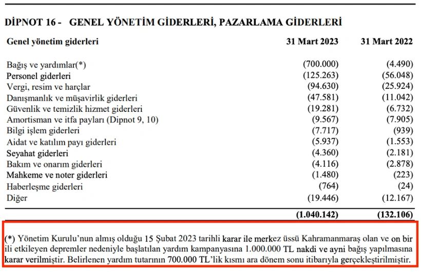 “Yönetim kurulunun almış olduğu 15 Şubat 2023 tarihli kararla merkez üssü Kahramanmaraş olan ve on bir ili etkileyen depremler nedeniyle başlatılan yardım kampanyasına 1 milyar lira nakdi ve ayni bağış yapılmasına karar verilmiştir. Belirlenen yardım tutarının 700 milyon liralık kısmı ara dönem sonu itibarıyla gerçekleştirilmiştir.”