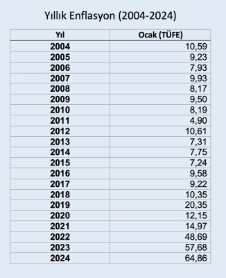 Son 20 yılda ocak ayında gerçekleşen yıllık tüketici enflasyonu 2024'te zirve yaptı. TÜİK son 20 yılın en yüksek Ocak ayı yıllık enflasyonunu açıkladı ancak bu veriler de tartışmalı olmaya devam ediyor. TÜİK, yargı kararına rağmen yine madde fiyat listesini açıklamadı. TÜİK Ocak ayı için "hissedilen" enflasyon oranını açıklamadı."