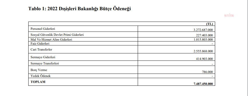 Sayıştay'ın 2022 yılı Dışişleri Bakanlığı Denetim Raporu yayınlandı. Rapordaki verilere göre; Dışişleri Bakanlığı'nın 2021 yılında toplam 7 milyar 96 milyon 707 bin 580 lira 51 kuruş olan bütçesi, 2022 yılında 10 milyar 942 milyon 311 bin 761 liraya çıktı.