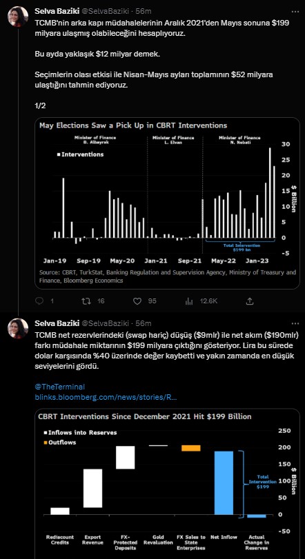 Bloomberg ekonomisti Selva Baziki, seçim öncesi süreçte Merkez Bankası'ndan satılan döviz miktarının 52 milyar dolara ulaştığını tahmin ettiklerini aktardı.