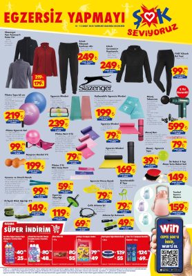 Erkek sweatshirt kapüşonlu ürününde de 249 tl fiyat bulunurken fitilli yüksek bel tayt 99,95TL fiyatıyla Slazenger markalı olarak satılıyor. Şok 10 Şubat 2024 bir diğer fırsat yönünde pilates topu 65 cm 219 TL fiyatla satılıyor. Pilates egzersiz seti 99,95 tl fiyatla öne çıkarken pilates üçlü bant 79,95 tl fiyatta müşteri bekliyor. Egzersiz minderi 239 liradan satışa çıkıyor. Katlanabilir egzersiz minderinde 199 TL fiyat bulunurken egzersiz minderi isimli ürün 79,95 tl fiyatına satılıyor. Masaj tabancasına 2 yıl garanti ve 599 break l fiyat sizlerle buluşurken masaj barı 79,95 liradan müşterisi karşısına çıkıyor masaj egzersiz topu 39 95 liradan ve askılı 180x60cm egzersiz minderi 169 liradan satılıyor. Şok Aktüel kataloglarının devamında bulunan bir başka üründe Neopren dambıl 2li 199 liradan satılıyor. Üçlü mini loop band pilates ürününde ise 59,95 TL fiyat bulunuyor.